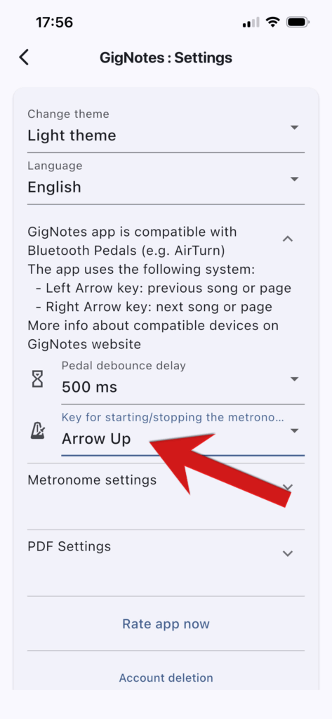 Check your pedal’s documentation to find which key it sends (for example, Arrow Up) and select the corresponding key in GigNotes.