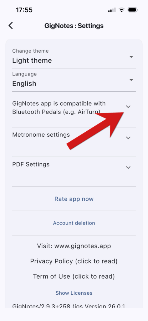 - Expand the section “GigNotes app is compatible with Bluetooth pedals” (see the image).